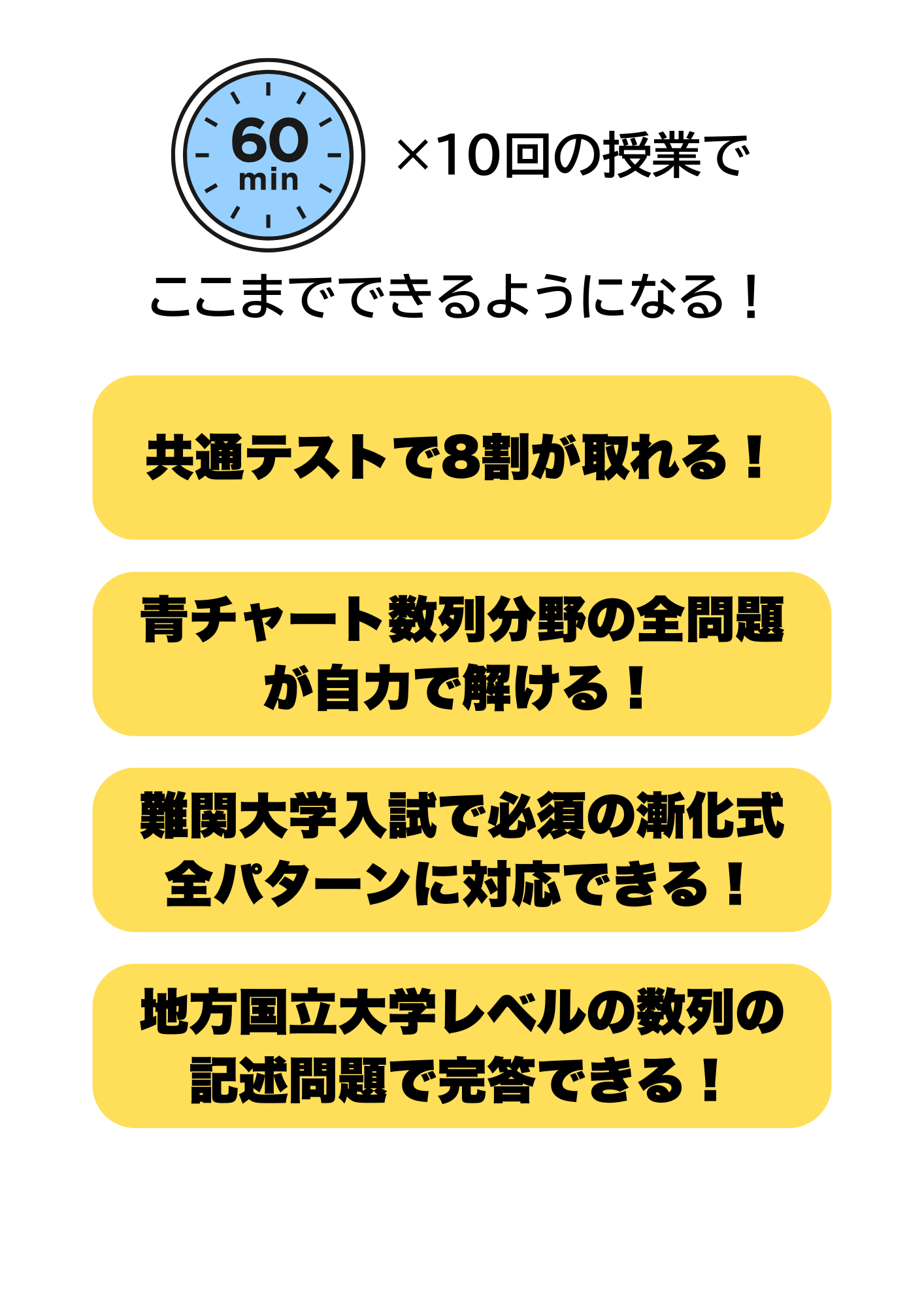 実際に、数列が苦手だった多くの生徒が、たった10回の授業で偏差値を10以上伸ばしてきました。